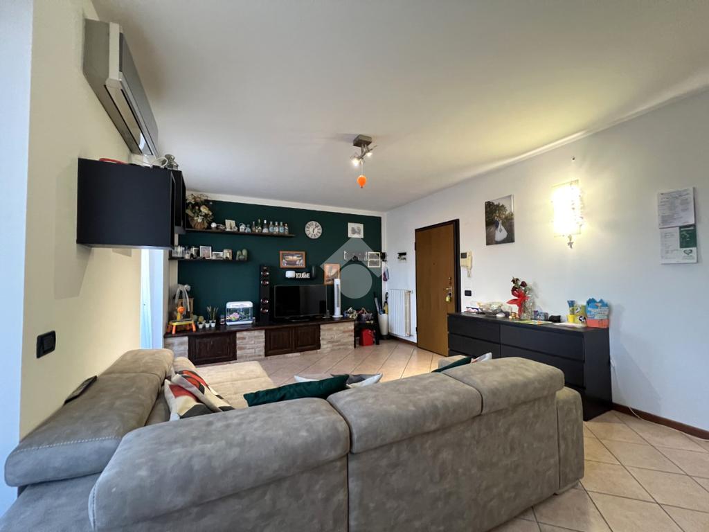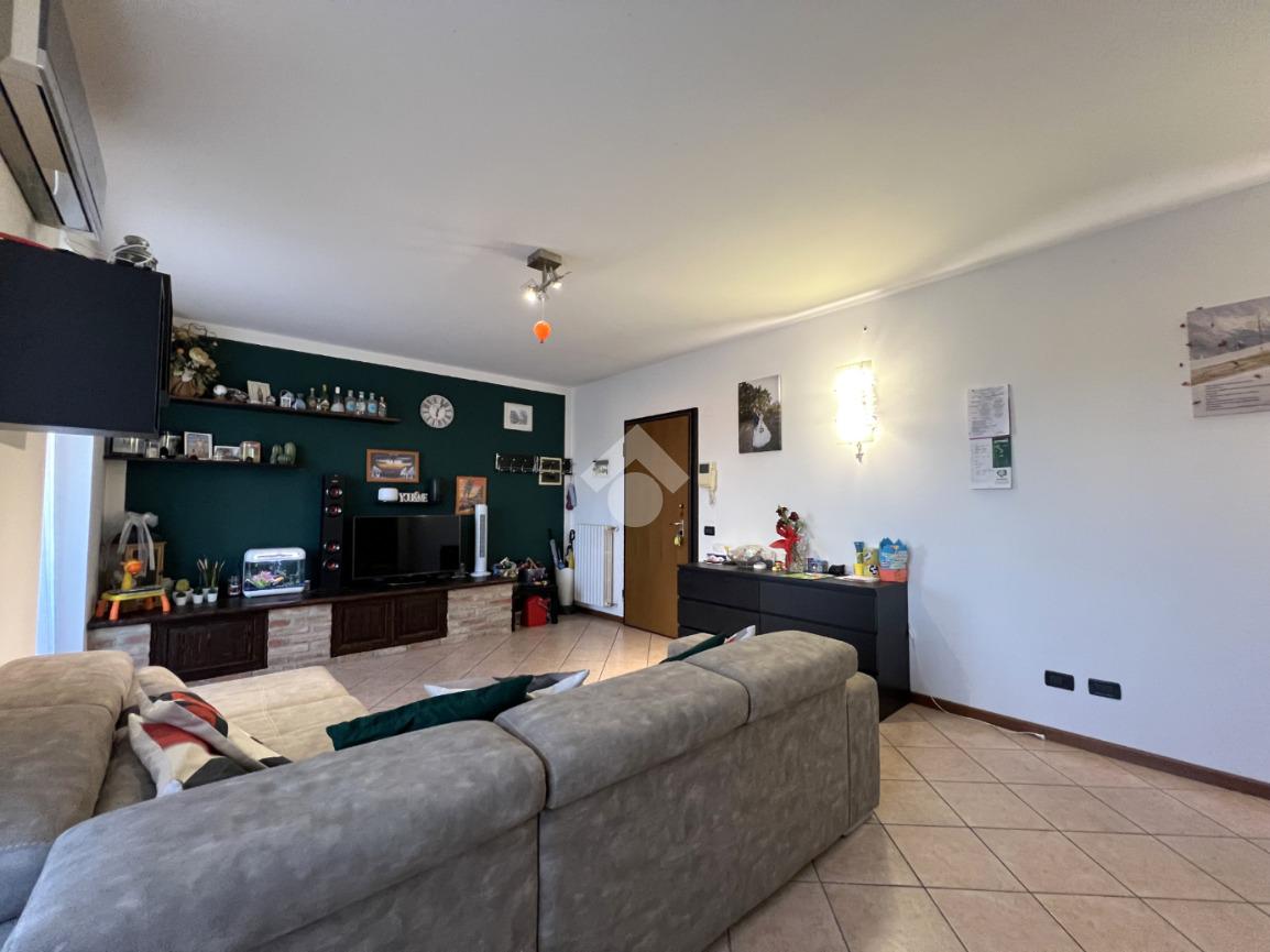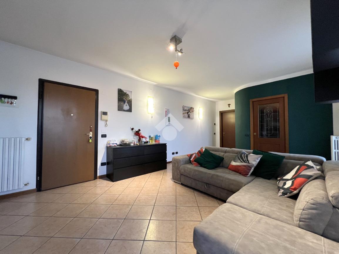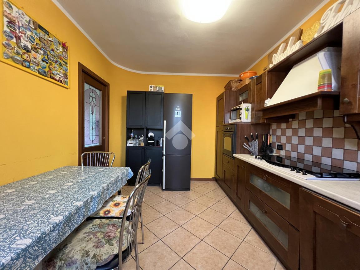 Un'elegante porta scorrevole separa il soggiorno dalla cucina abitabile, dove spazio e funzionalità si combinano perfettamente per una zona giorno accogliente e versatile.