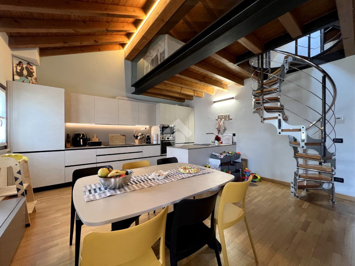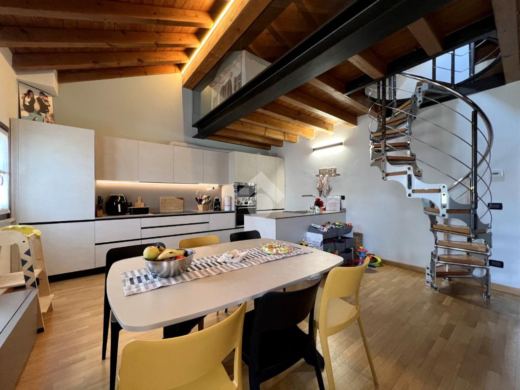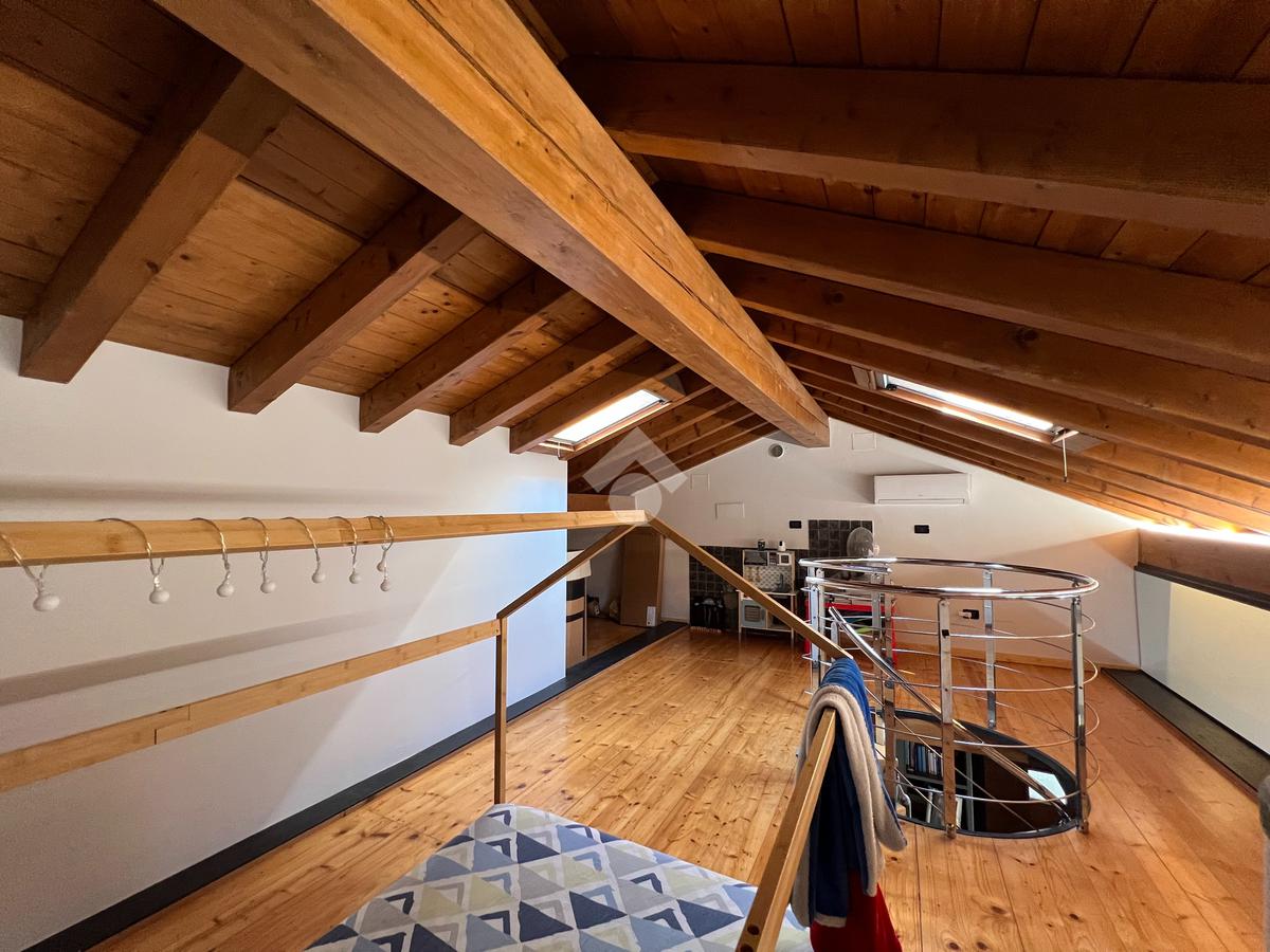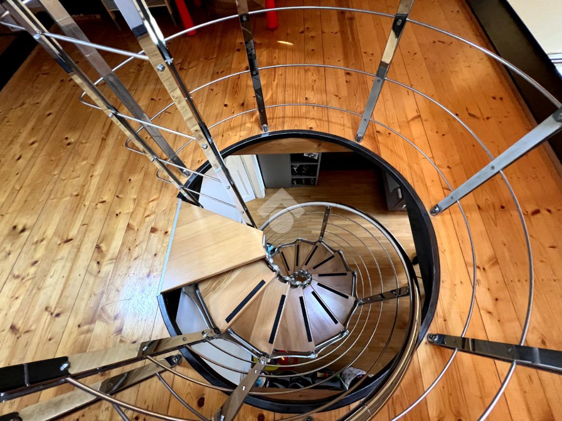 L’immobile si trova al primo piano. L’ingresso si apre sulla zona giorno, composta da soggiorno e cucina in open space, valorizzata dalla presenza di una scala a chiocciola in legno che conduce al soppalco.