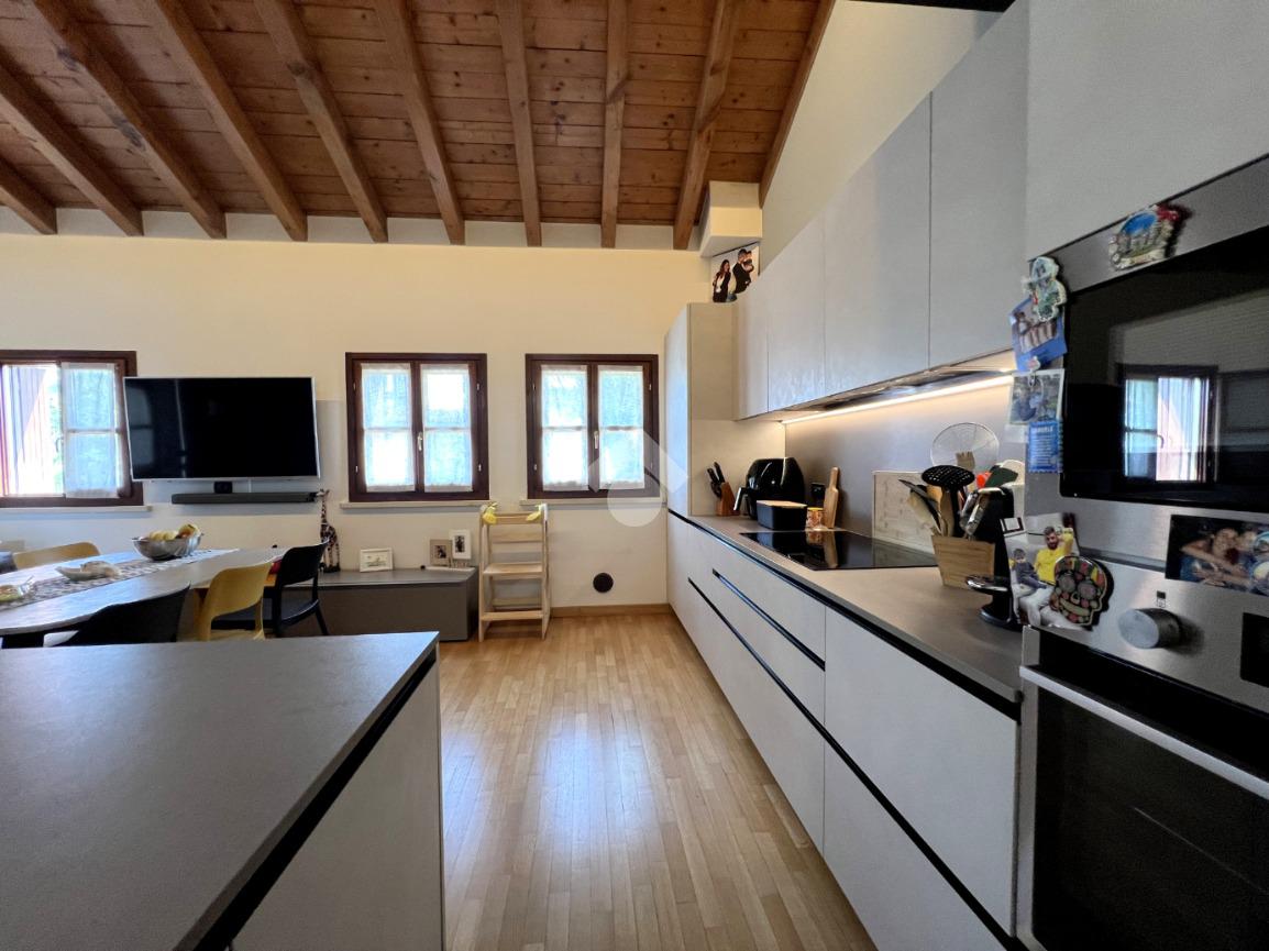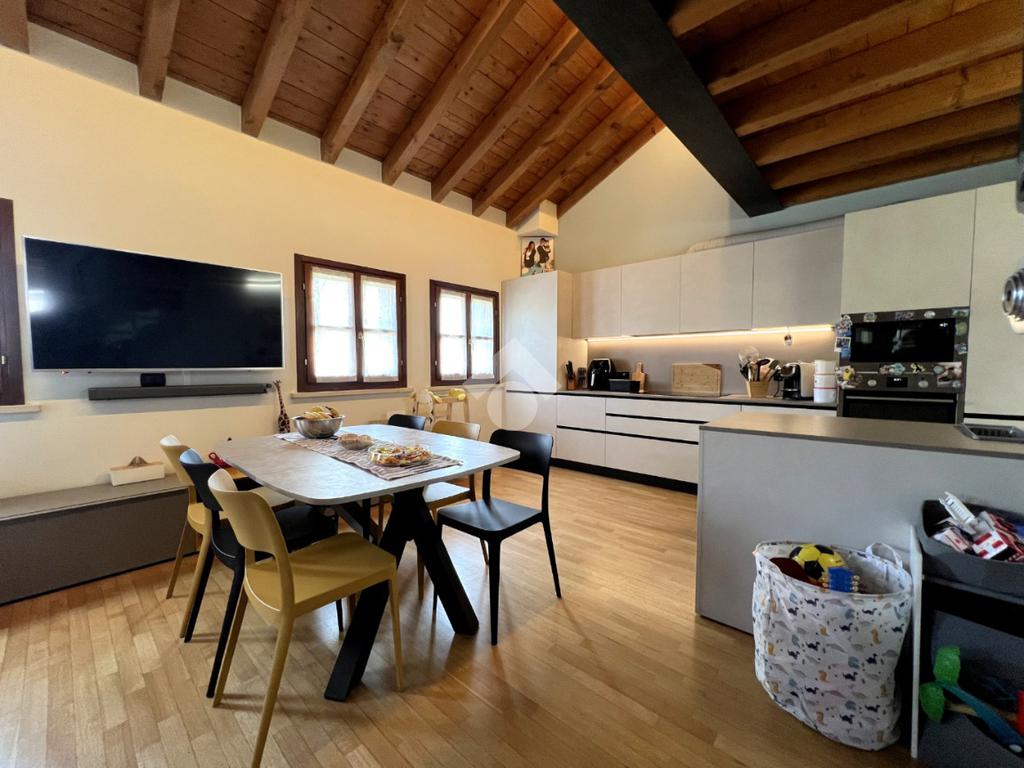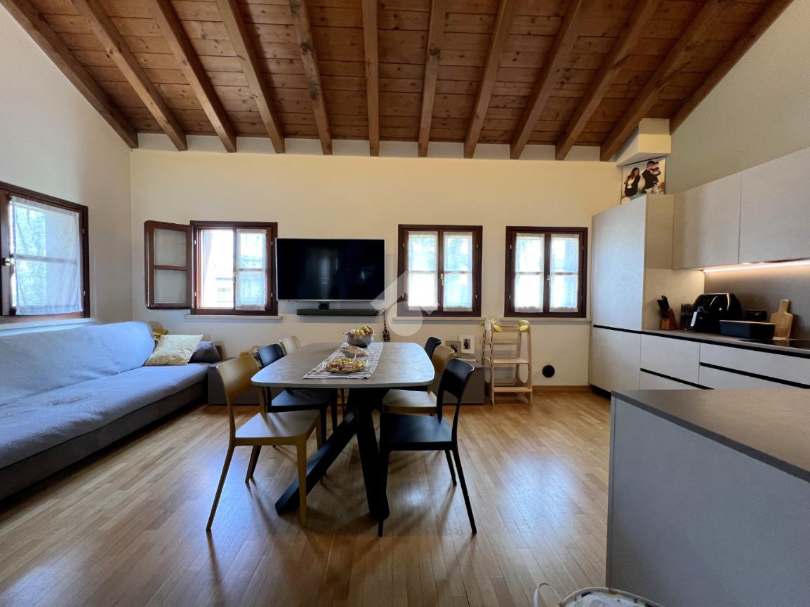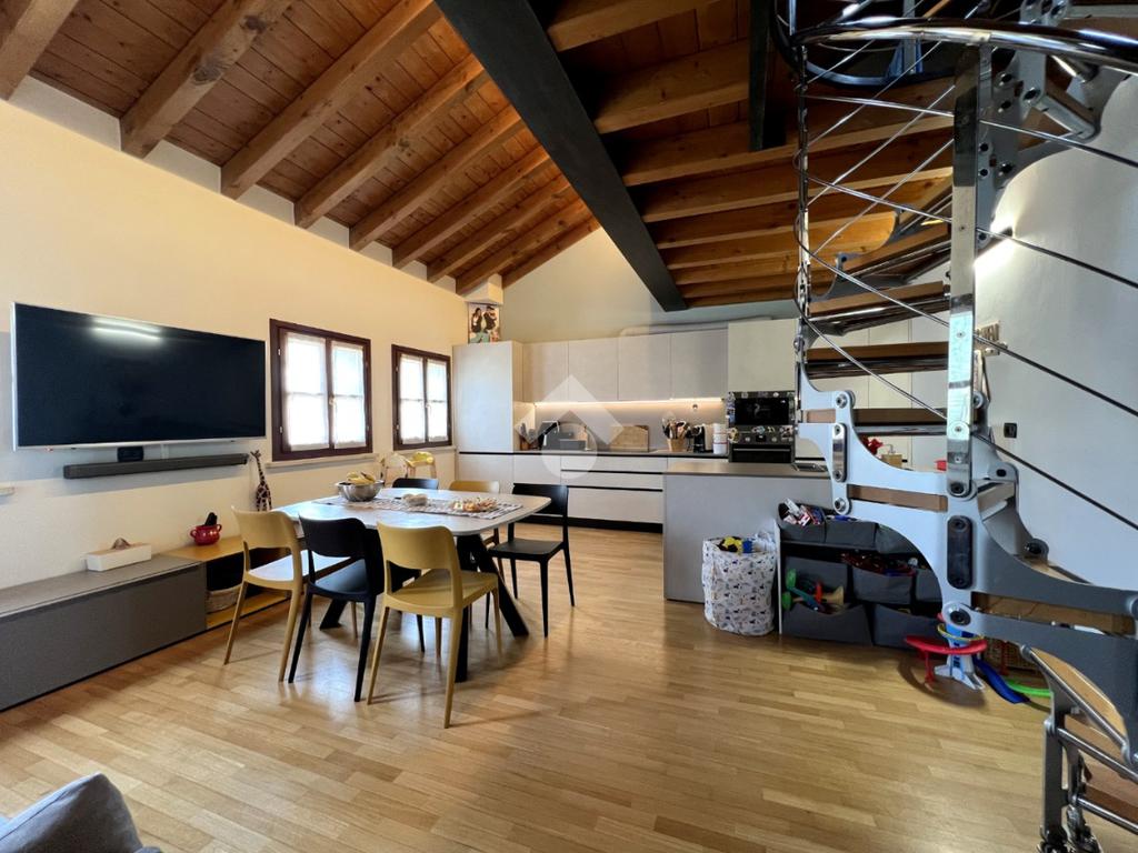L’immobile si trova al primo piano. L’ingresso si apre sulla zona giorno, composta da soggiorno e cucina in open space, valorizzata dalla presenza di una scala a chiocciola in legno che conduce al soppalco.
