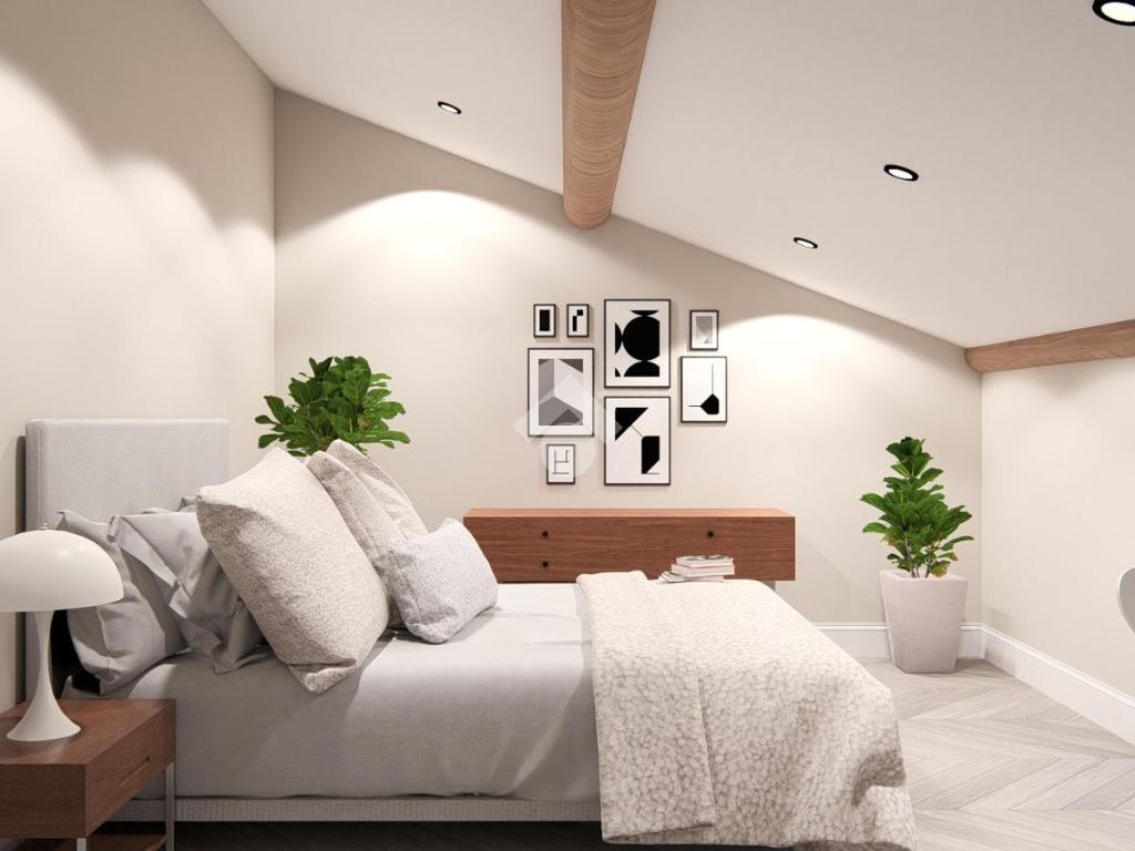 Dalla cucina, una comoda scala conduce alla zona notte, che include due camere da letto: una matrimoniale, con cabina armadio, e una singola. La camera padronale, spaziosa e confortevole.
