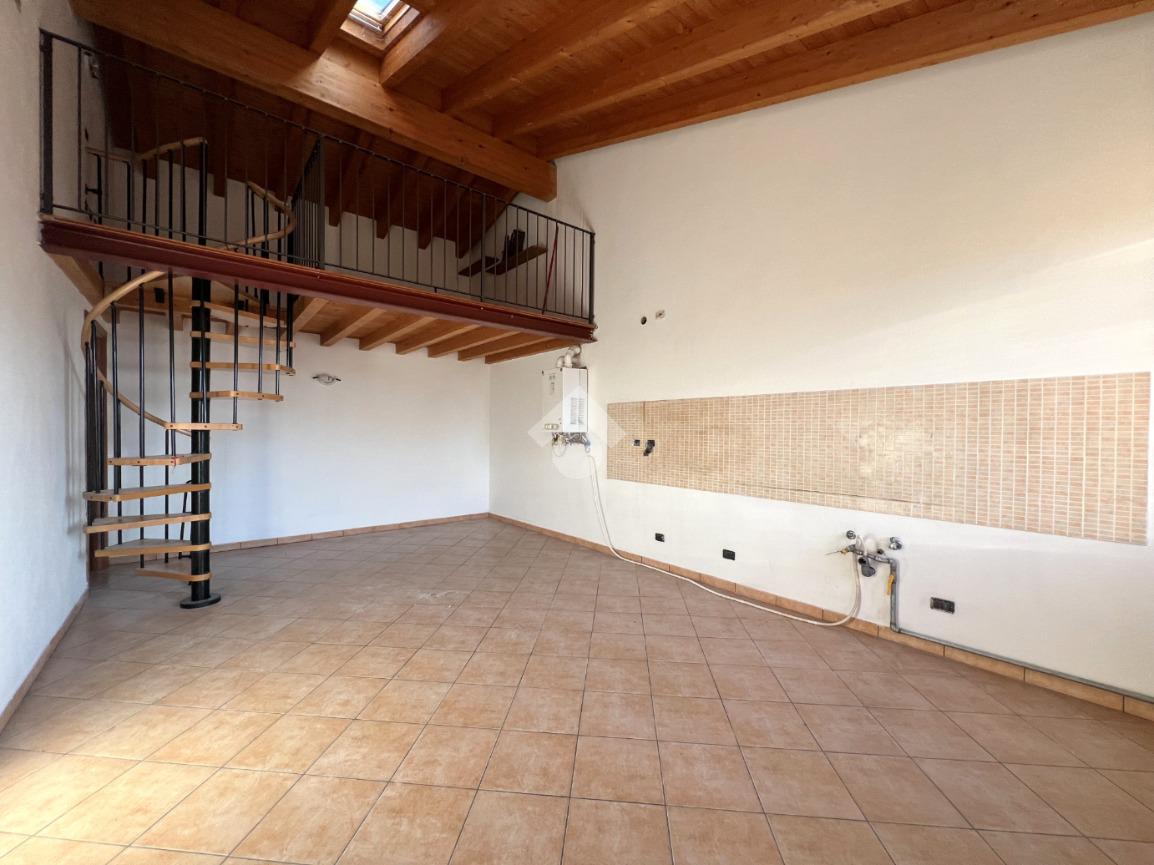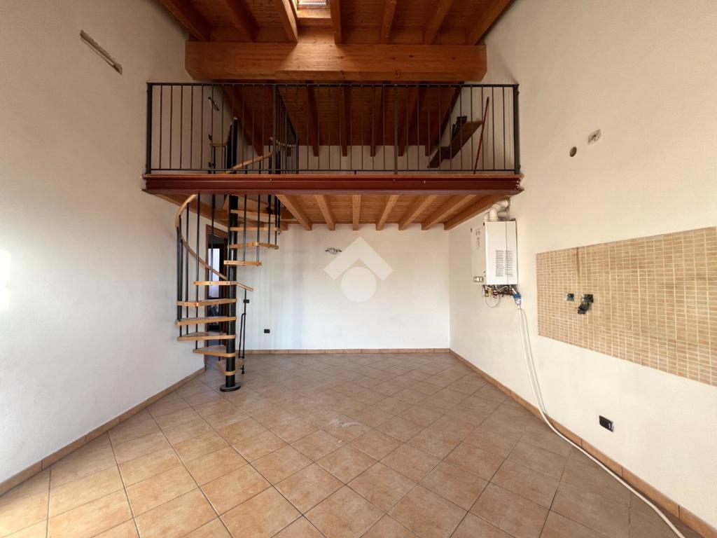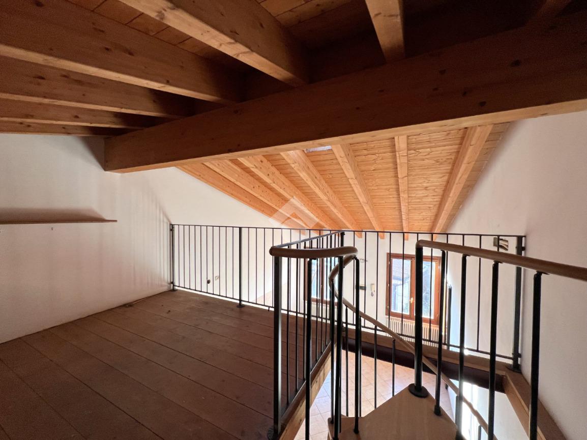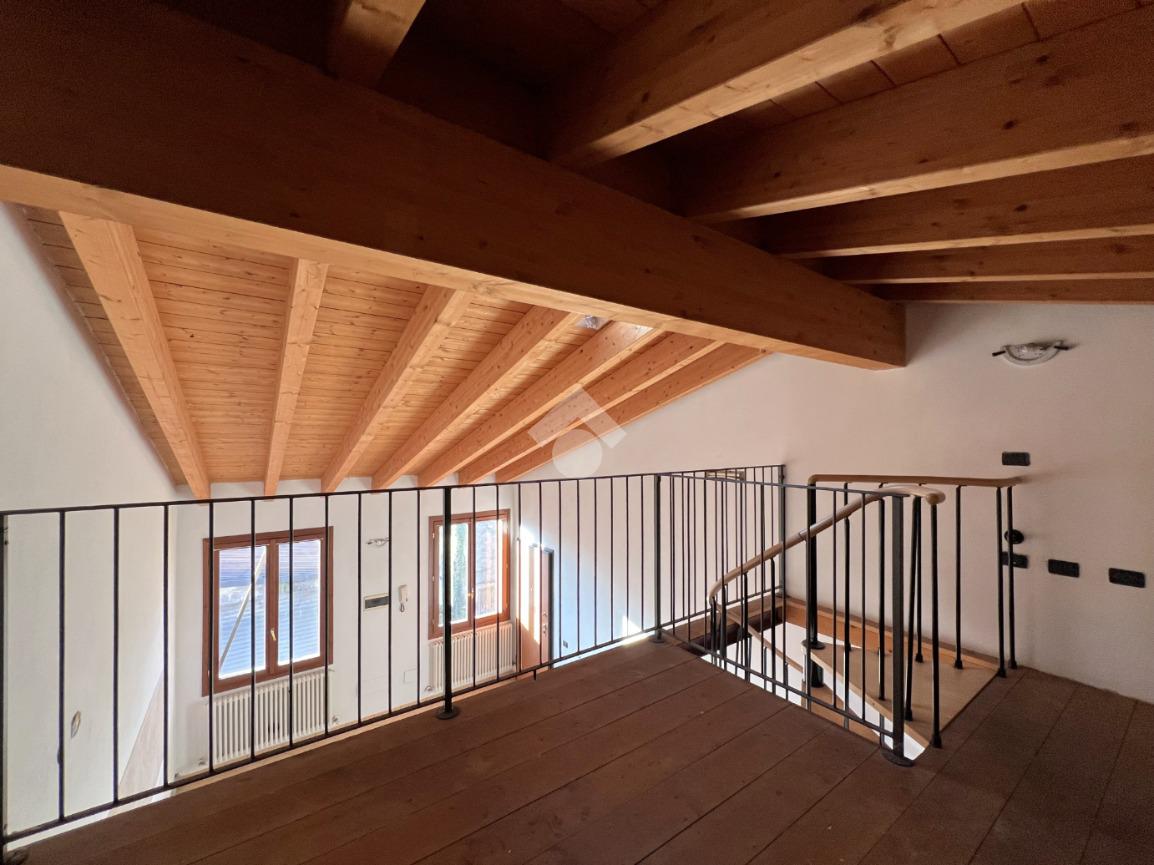L’ingresso si apre su una luminosa zona giorno con cucina e soggiorno in open space, valorizzato da soppalco e travi a vista in tonalità marrone, elementi che donano calore e carattere all’ambiente.