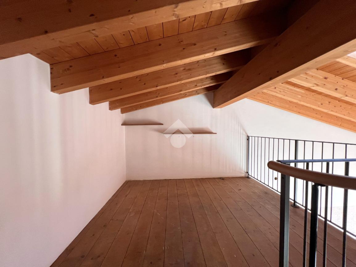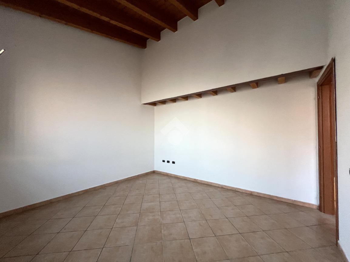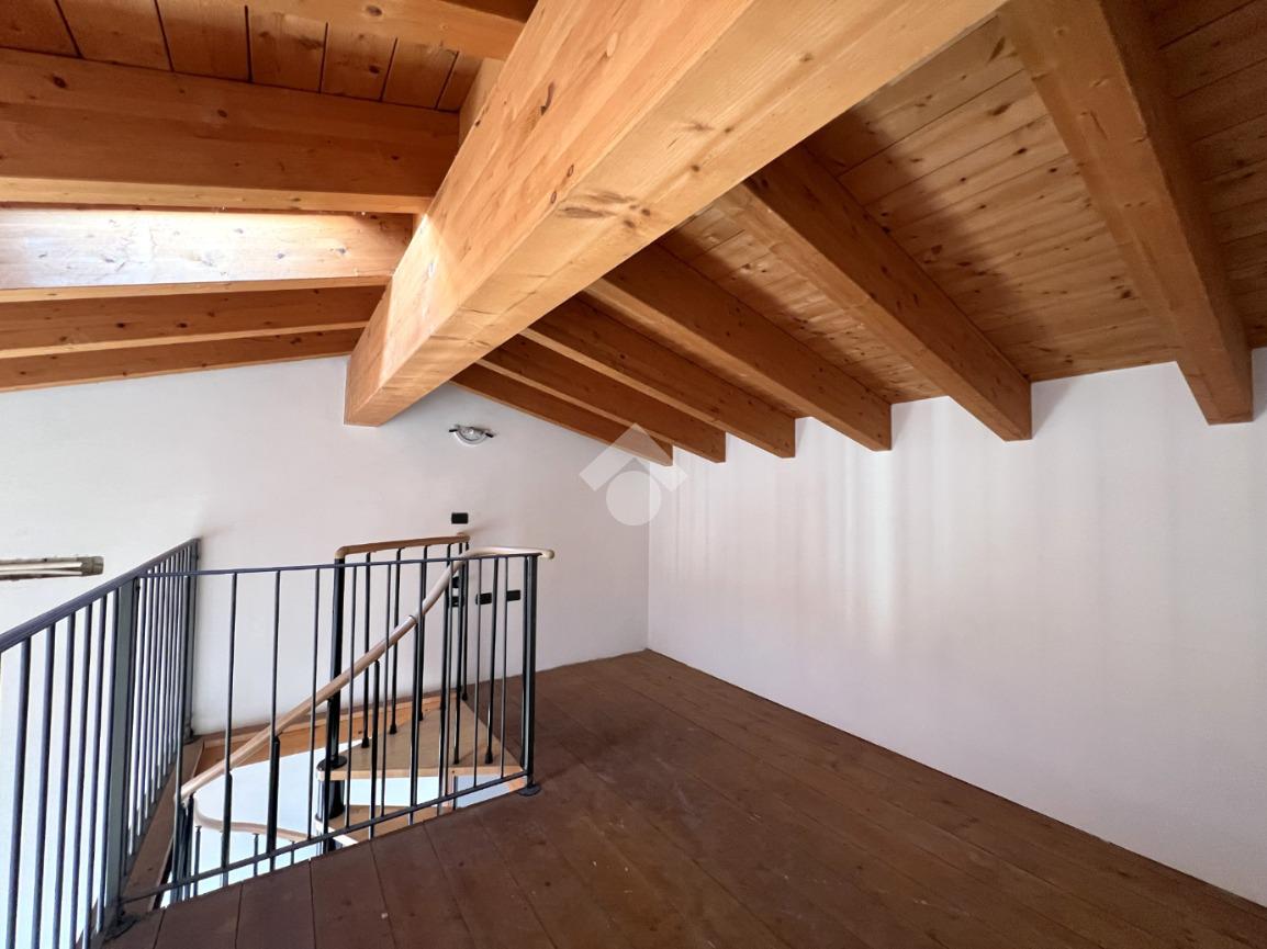 L’ingresso si apre su una luminosa zona giorno con cucina e soggiorno in open space, valorizzato da soppalco e travi a vista in tonalità marrone, elementi che donano calore e carattere all’ambiente.